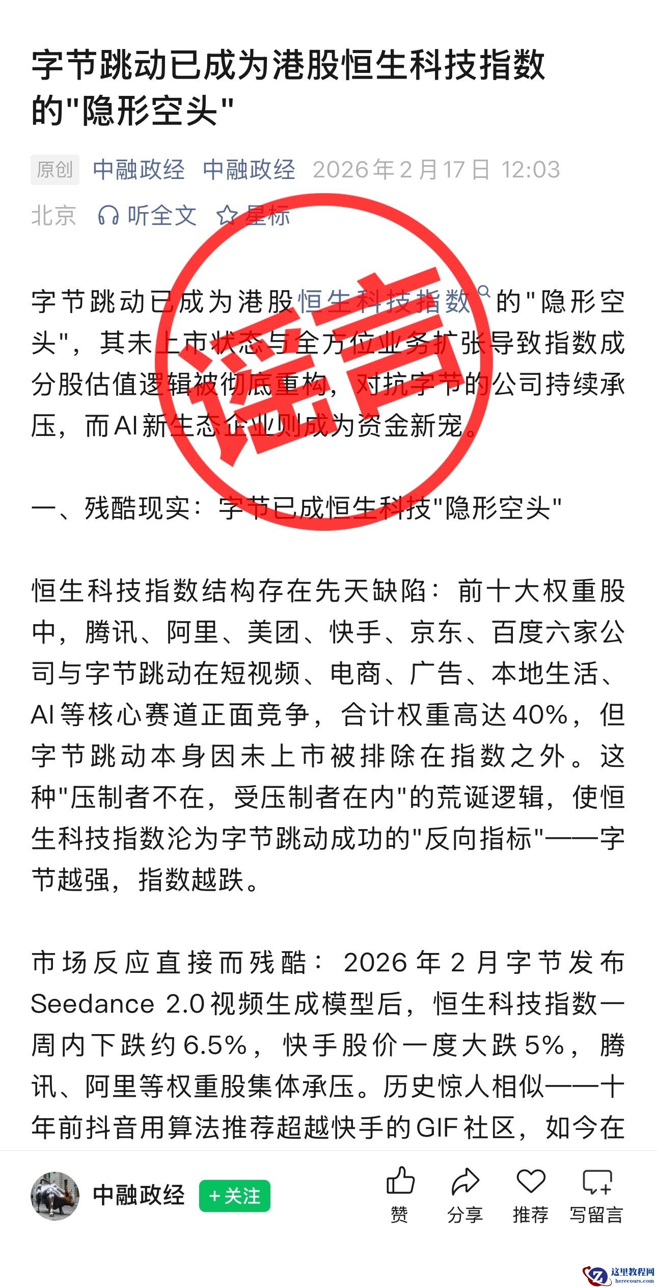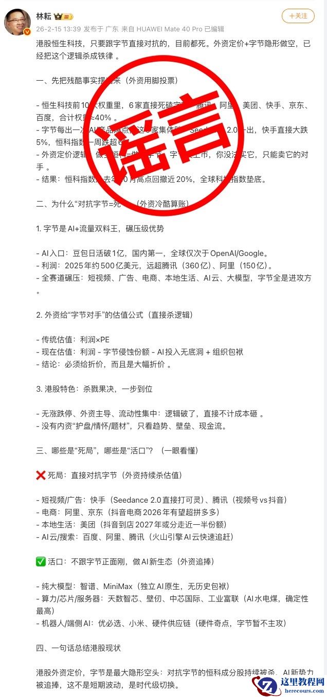 春节前夕,字节发布了文生视频大模型 Seedance 2.0,引发行业关注,有支持也有批评,在此一并感谢。我们也发现,网络上有人散布所谓“字节跳动是恒科指数最大空头”的荒谬、毫无逻辑的观点,如果这只是股民的调侃与吐槽,倒是可以理解,毕竟大家都希望股票能涨。但看到一些财经大 V 和大量营销号也在“有组织”“肆无忌惮”地传播这种言论,感觉还是需要和大家说明一下。