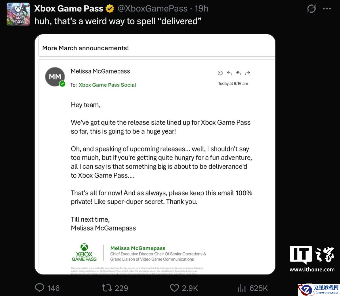 不过,微软在原文中将“delivered”单词写成了“deliverance”,官方也在配文中提醒读者“这个单词的拼写方式真奇怪”。对此,外界推测这大概率是在暗示《天国:拯救 2(Kingdom Come: Deliverance 2)》即将加入 Xbox Game Pass 游戏阵容。