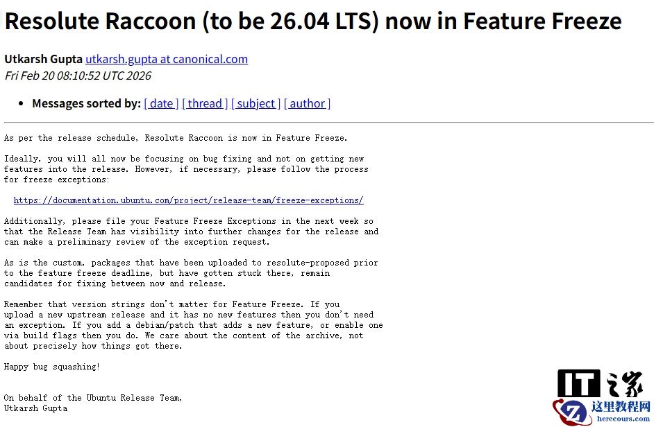 2 月 20 日消息,Ubuntu 26.04 LTS(长期支持版)的开发工作今日迎来关键转折点。Canonical 工程师 Utkarsh Gupta 代表 Ubuntu 团队宣布,代号为“Resolute Raccoon”的下一代操作系统已正式进入“功能冻结”阶段。