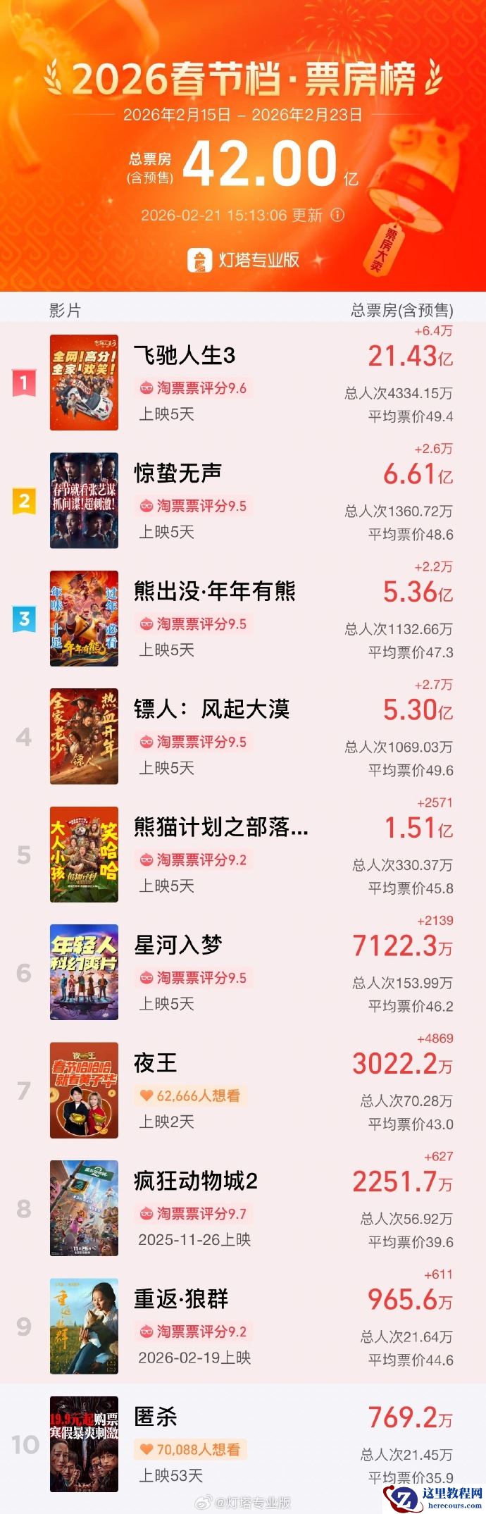 从灯塔专业版获悉,截至 2 月 21 日 15 时 13 分,2026 春节档(2 月 15 日-2 月 23 日)档期总票房(含预售)突破 42 亿。