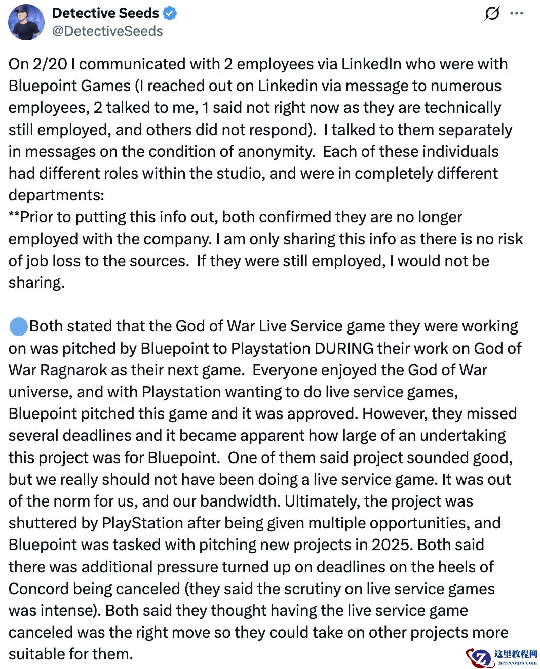 2 月 22 日消息,知名爆料人 Detective Seeds 昨天在 X 平台发文称,他已经与两名前蓝点工作室员工联系上,聊及工作室解散内幕。