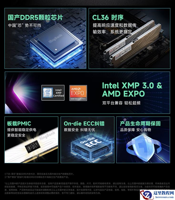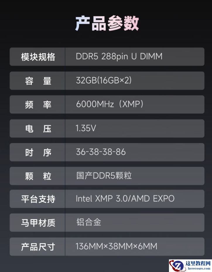 该 RAM 内存条支持英特尔 XMP 3.0 和 AMD EXPO 超频,采用银白色马甲设计,工作电压为较低的 1.35V,详细时序为 CL36-36-36-80。