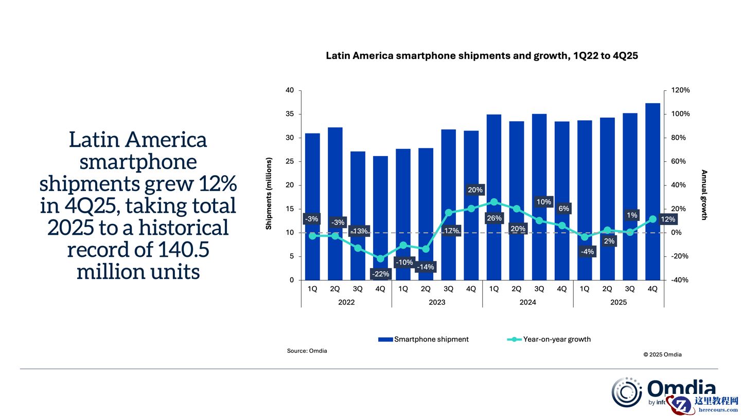 2 月 22 日消息,Omdia 在本月中旬的两份报告中指出,根据其数据统计,拉丁美洲与中东(除土耳其)智能手机市场在 2025 年均实现增长,出货规模分别达到 1.405 亿部和 5480 万部。