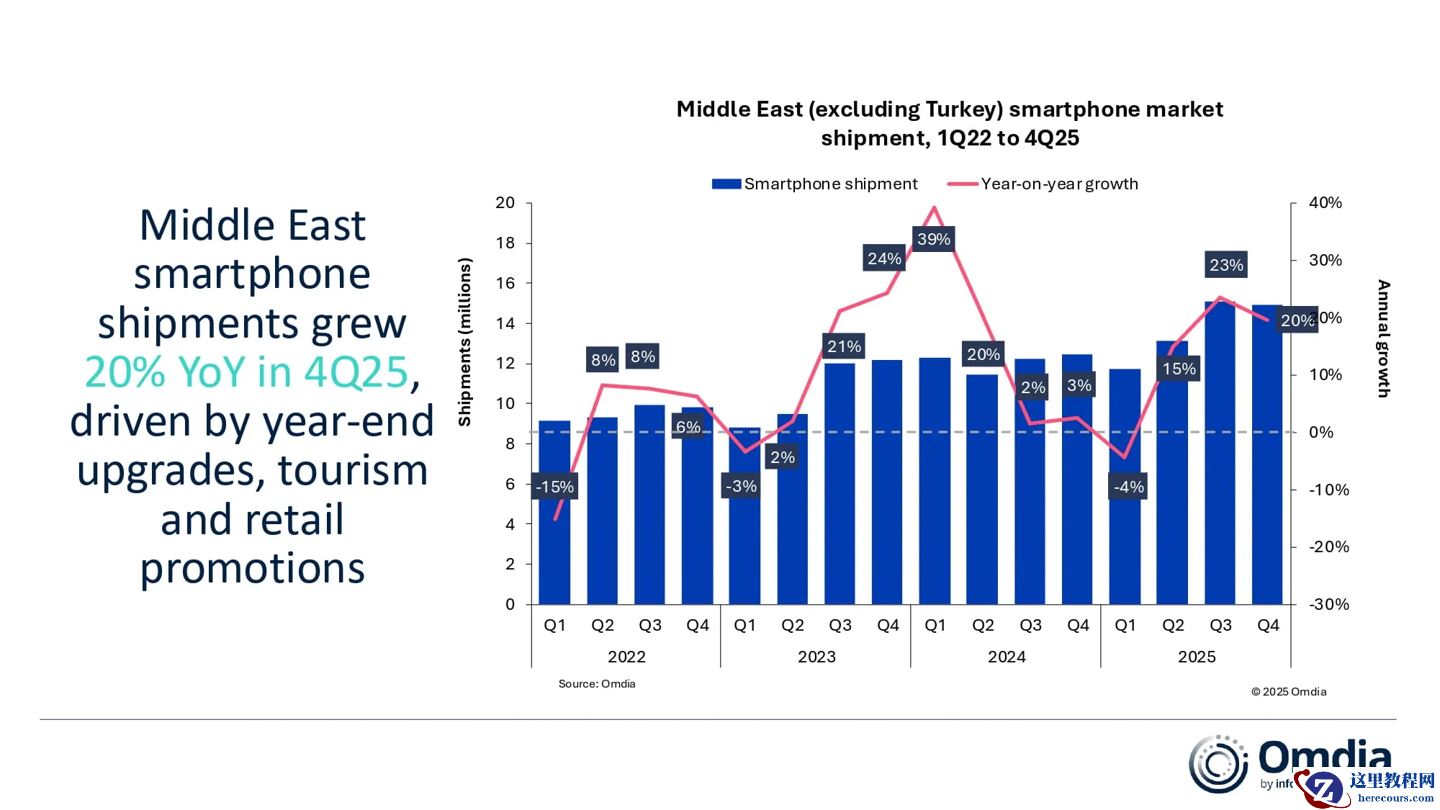 而中东市场的 2025 全年智能手机出货规模增幅为 13%,连续三年高于一成;2025Q4 出货 1490 万台,同比增长 20%,第三个季度实现两位数增长。与拉美类似,三星(同比 +41%)与荣耀(同比 +94%)是当地去年表现最为耀眼的手机厂商。