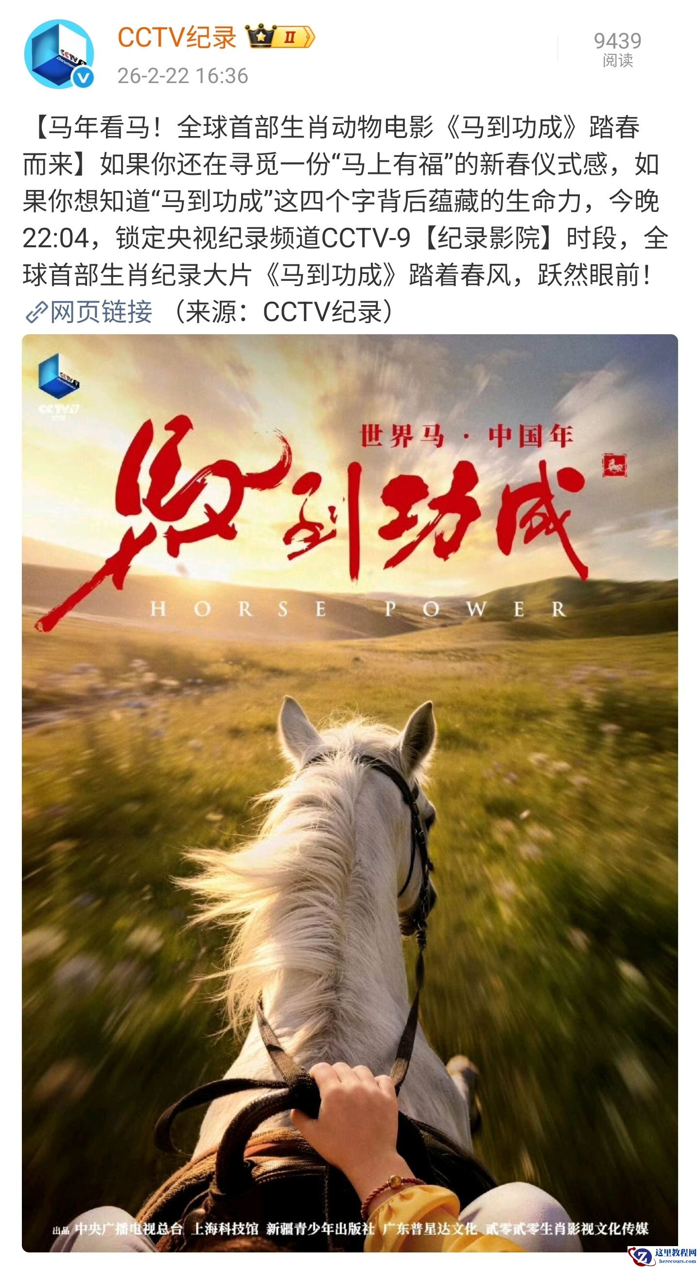 2 月 22 日消息,据央视新闻报道,全球首部生肖纪录大片《马到功成》将于今晚 22:04 在央视纪录频道 CCTV-9【纪录影院】时段播出。