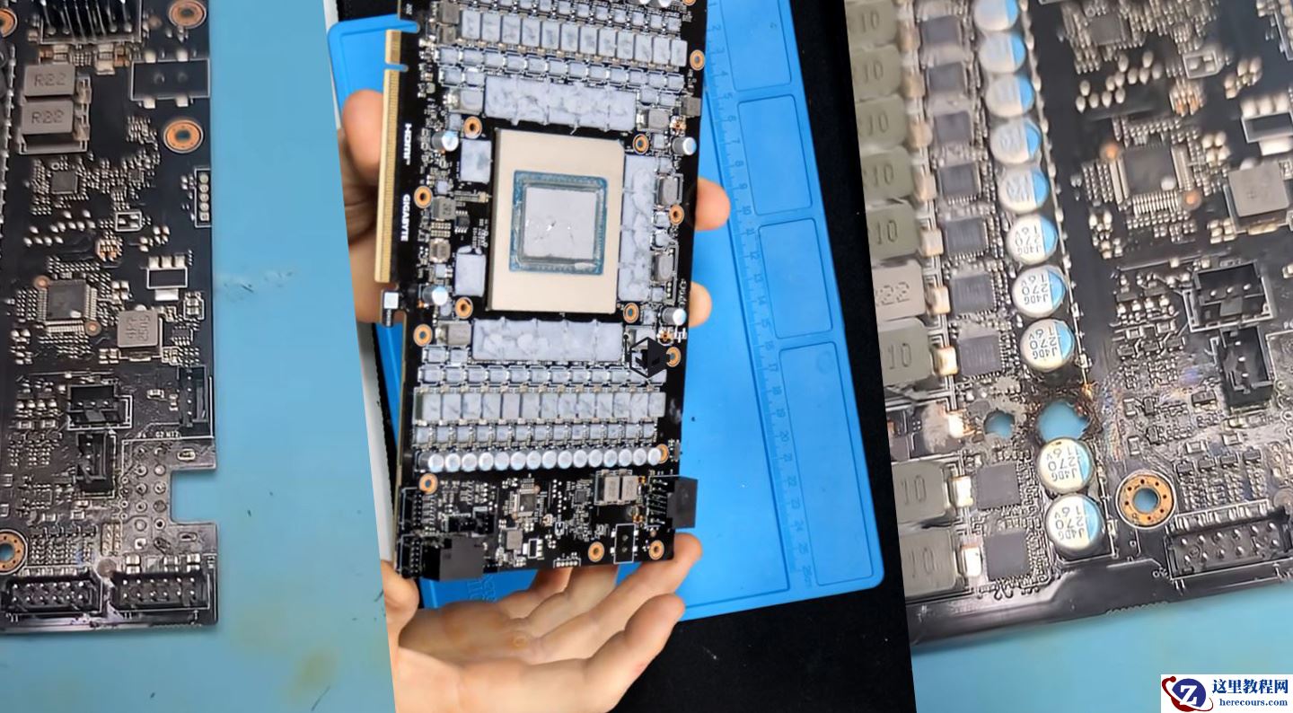 从视频截图中可以看到,其 PCB 上留下了两个明显的烧灼孔洞,一颗电容也因高温而脱落。幸运的是,GPU 核心和显存芯片未受损坏。