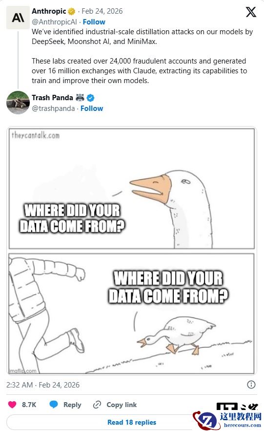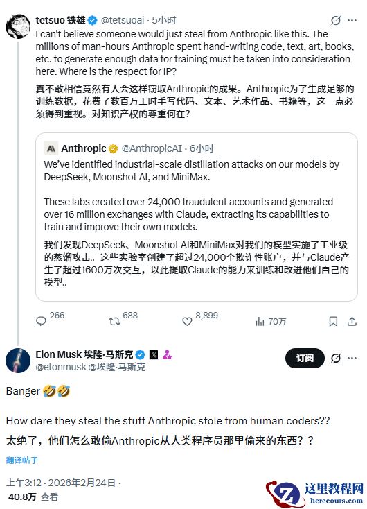 注意到,创立 xAI 的埃隆 · 马斯克也发声评论,发推文称:“他们(中国)怎么敢偷 Anthropic 从人类程序员那里偷来的东西?”,指责该公司未经许可使用软件开发者的项目数据训练 AI。