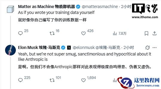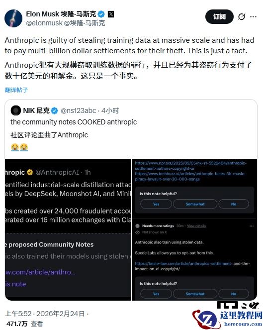 马斯克还称,“Anthropic 犯有大规模窃取训练数据的罪行,并且已经为其盗窃行为支付了数十亿美元的和解金。这只是一个事实。”对此有网友称,Grok 的训练数据也是偷窃的,马斯克回应称,“是啊,但我们不会像 Anthropic 那样对此表现得极度自鸣得意、伪善又虚伪。”