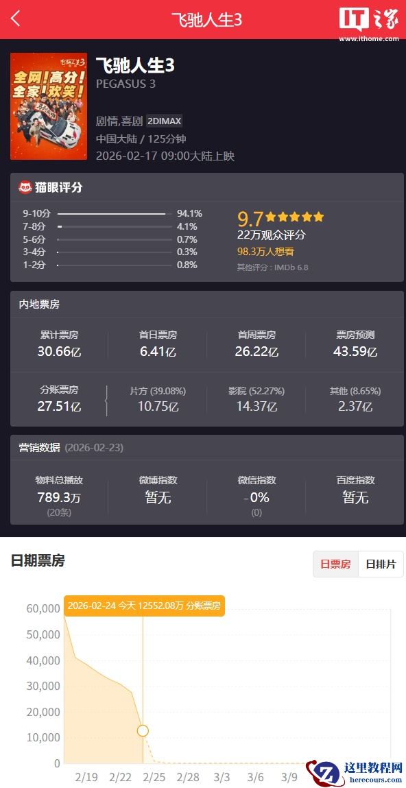 查询猫眼专业版数据,《飞驰人生 3》累计票房已突破 30 亿元,总票房预测来到 43.59 亿元。