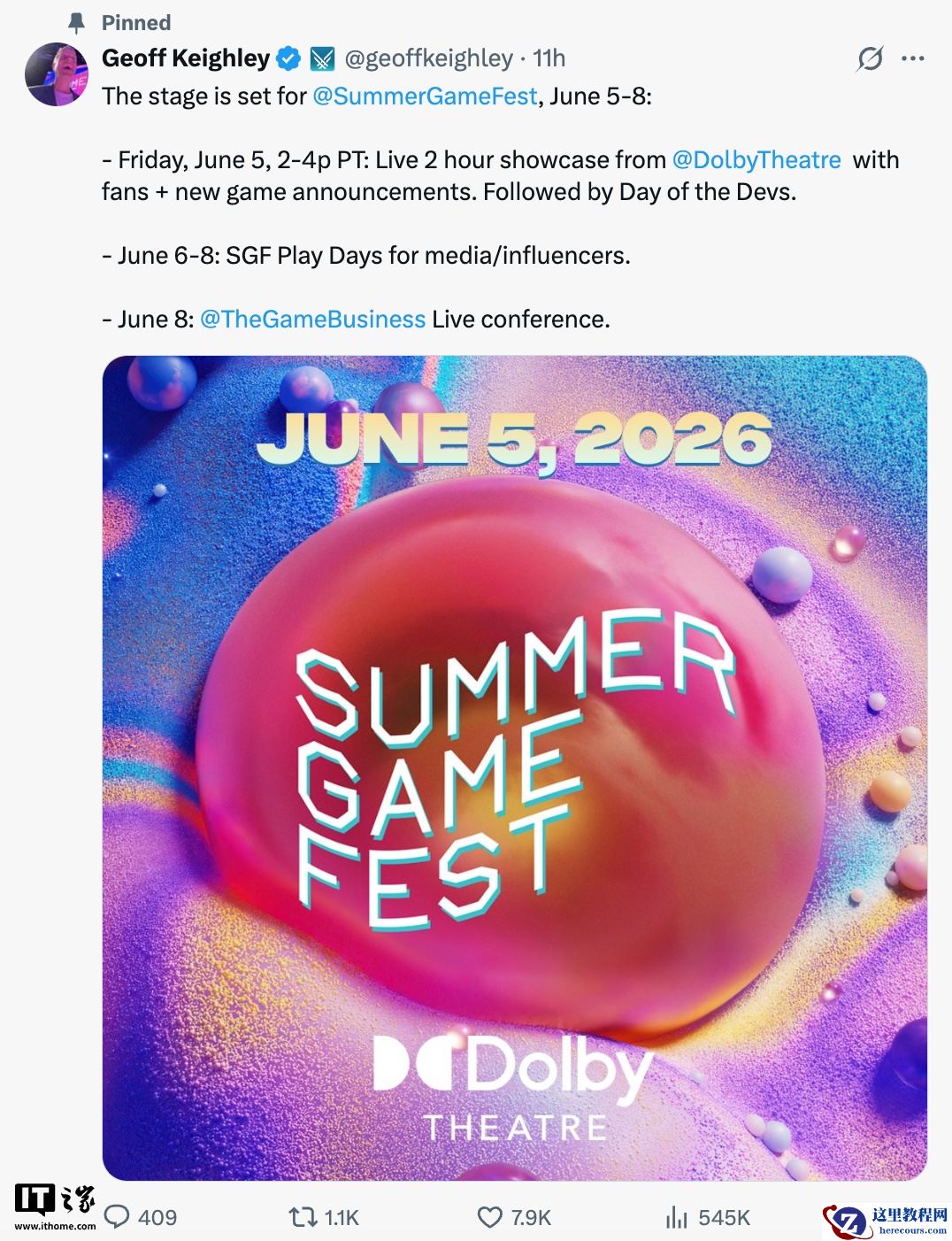 2 月 24 日消息,夏日游戏节主持人 Geoff Keighley 宣布,2026 年度夏日游戏节(注:Summer Game Fest 2026)将于北京时间 6 月 6 日早晨 5 点在洛杉矶杜比剧院举办,整体时长约两小时。