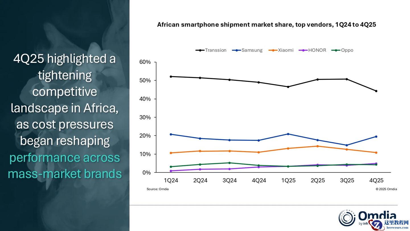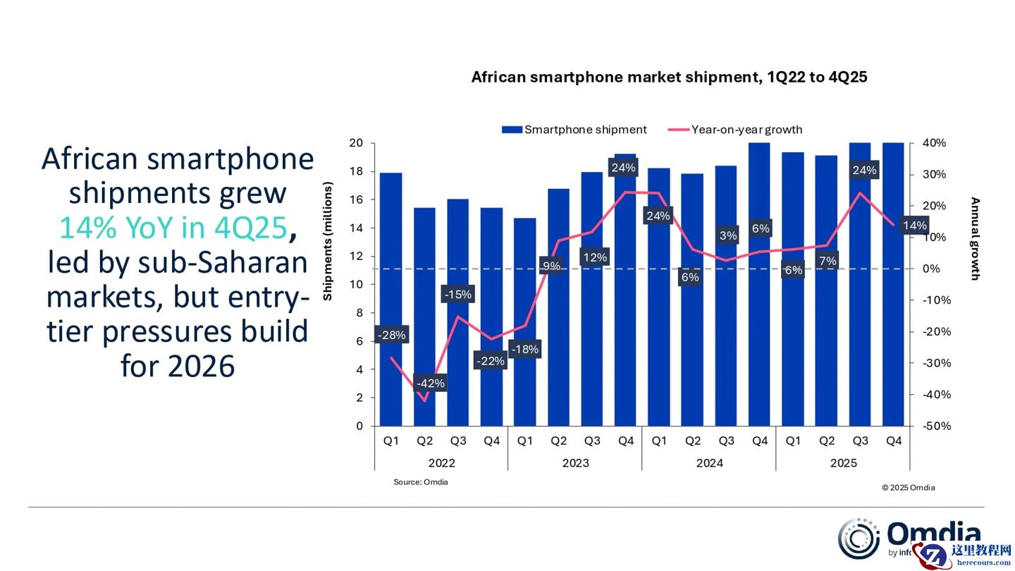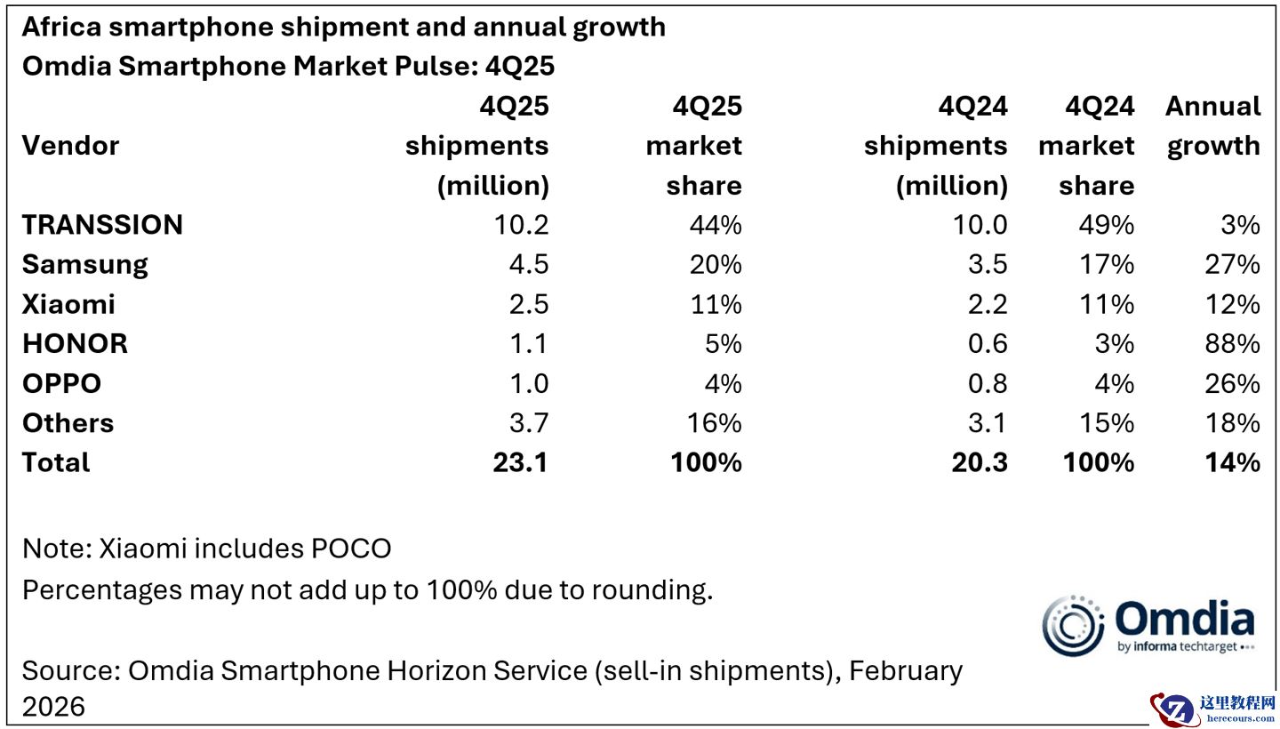2 月 25 日消息,市场研究机构 Omdia 今日发布的最新研究报告显示,非洲智能手机市场在 2025 年第四季度表现强劲,出货量同比增长 14%,达到 2310 万台。