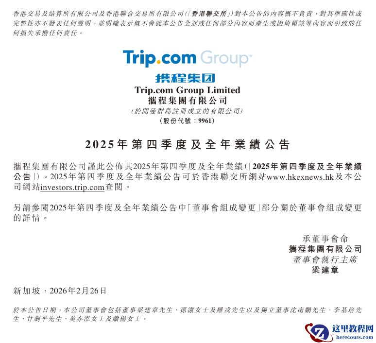 2 月 26 日消息,今日,携程集团在港交所公布 2025 年第四季度及全年未经审计财务业绩。