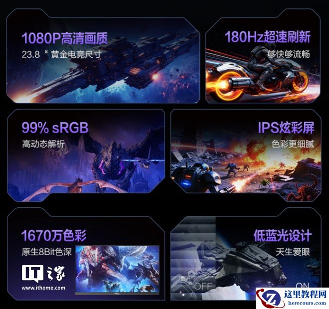 该机配备一块 1920x1080 分辨率 180Hz IPS 面板,亮度 250 尼特,GtG 响应速度 5ms,支持原生 8-Bit 色彩,覆盖 99% sRGB 色域。
