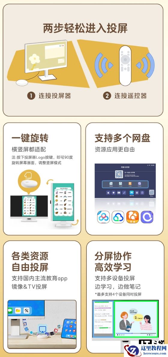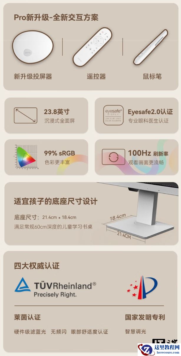 该机采用白色外壳、白色支架,配备一块 1920x1080 分辨率 100Hz 面板,GtG 响应速度 5ms,静态对比度 1300:1,覆盖 99% sRGB 色域。显示器配有投屏器,用户可以使用投屏器内的系统连接手机电脑及网盘。