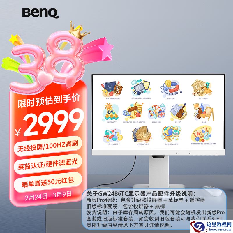 2 月 27 日消息,明基现已在京东上架“GW2486TC”23.8 英寸显示器,该机为 1080P 100Hz 规格,主打教育市场,提供了投屏器 / 鼠标笔和遥控器,定价为 2999 元。
