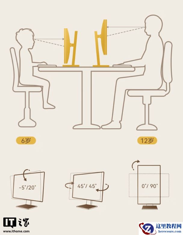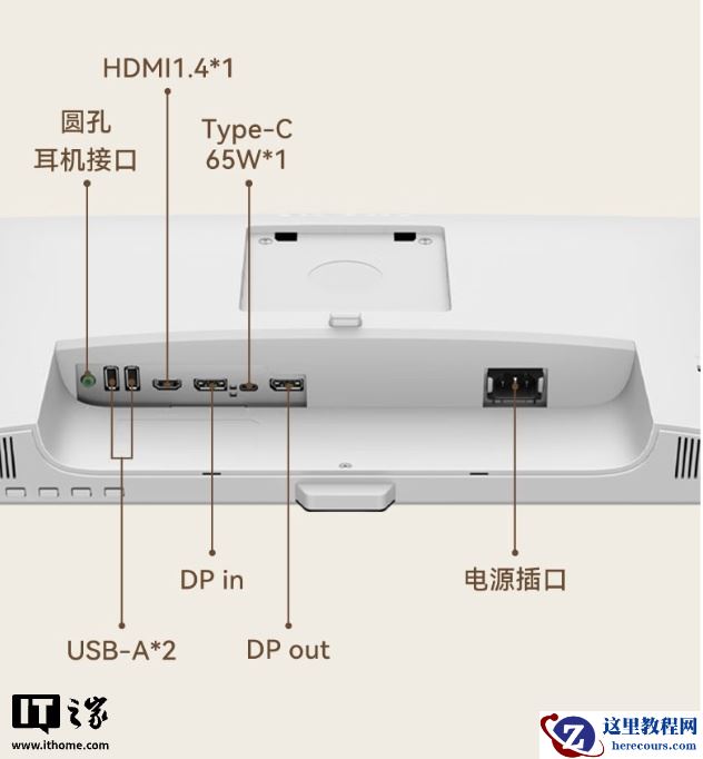 该机支架支持升降 / 倾斜 / 旋转,内置光线传感器 / 降噪麦克风,提供 2 个 USB-A 接口(KVM)、1 个 DP 接口、1 个 HDMI 1.4 接口、1 个 USB-C 65W 接口。