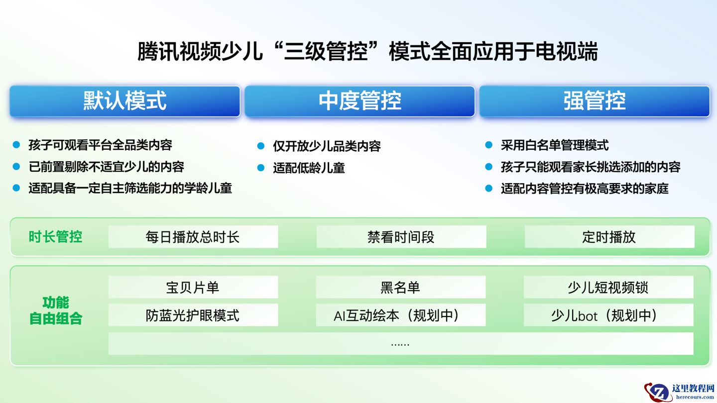 注意到,该模式支持默认模式、中度管控、强管控三档灵活切换,同时提供时长管理、宝贝片单、内容黑名单、少儿锁等功能。