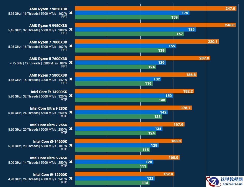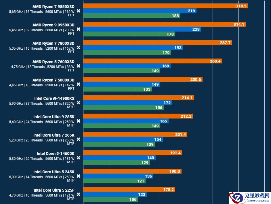 相比之下,作为英特尔阵营的顶级产品,酷睿 i9 14900KS 的平均帧率为 200 FPS 左右,落后了约 100 FPS。在纯光栅化渲染场景下,AMD 锐龙 7 9850X3D 领先竞品近 50%。