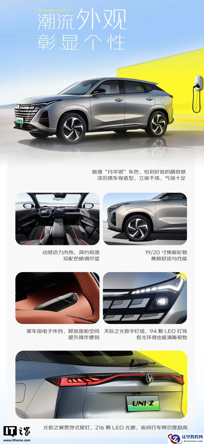 2026 款长安 UNI-Z PHEV 新增“月华银”车色,尺寸为 4730*1890*1680mm,轴距 2795mm,配有电子怀档、贯穿式尾灯。
