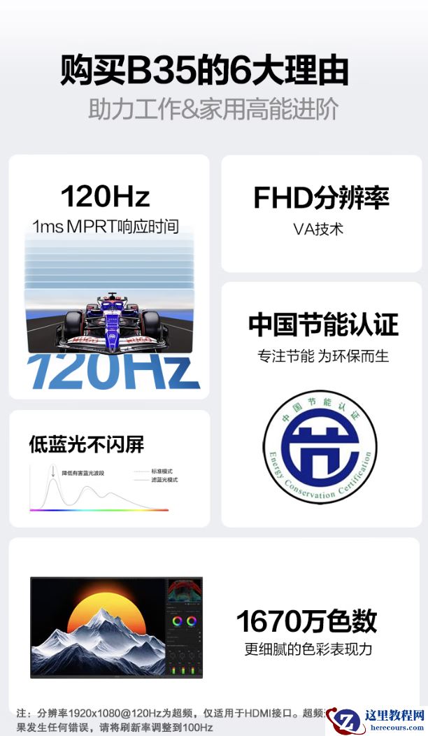 据介绍,这款显示器的分辨率是 Full HD(1920*1080),支持 120Hz 高刷,MPRT 响应时间为 1ms,内置 VA 广视角面板,最高亮度可达 250cd/m2,支持 HDR 模式,色深为 8 bit(1670 万色),内置 Clear Vision 技术,可增强画面清晰度。