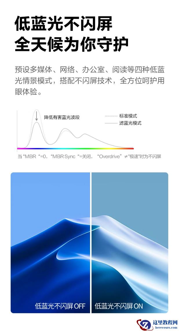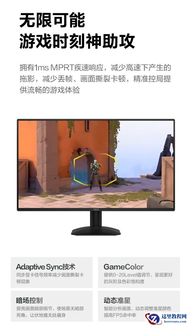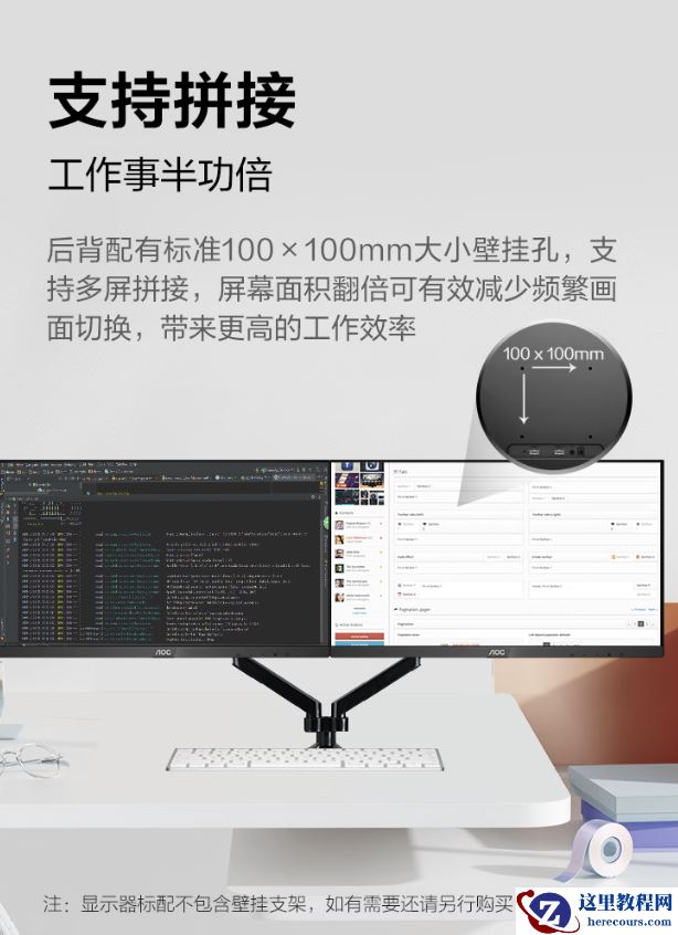规格方面,这款显示器支持 Adaptive Sync 技术,可减少画面卡顿、撕裂现象发生,支持暗场控制、动态准星等游戏功能,带有多媒体、网络、办公室和阅读四种低蓝光情景模式,后背带有标准 100*100mm 大小壁挂孔,支持多屏拼接。