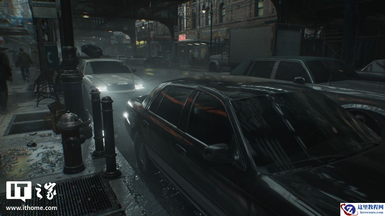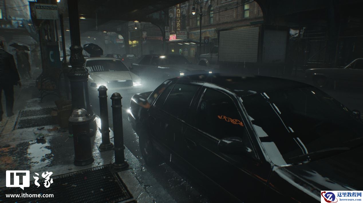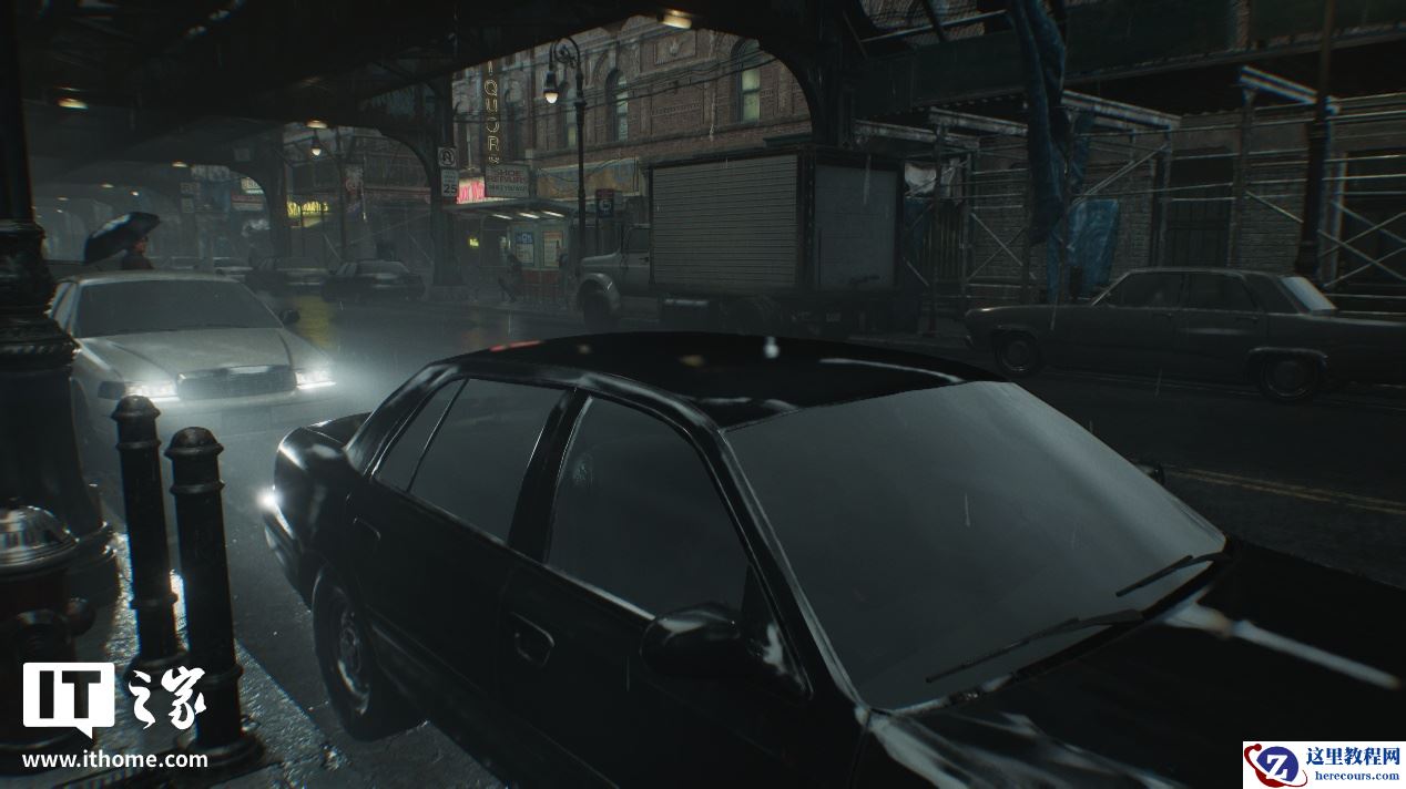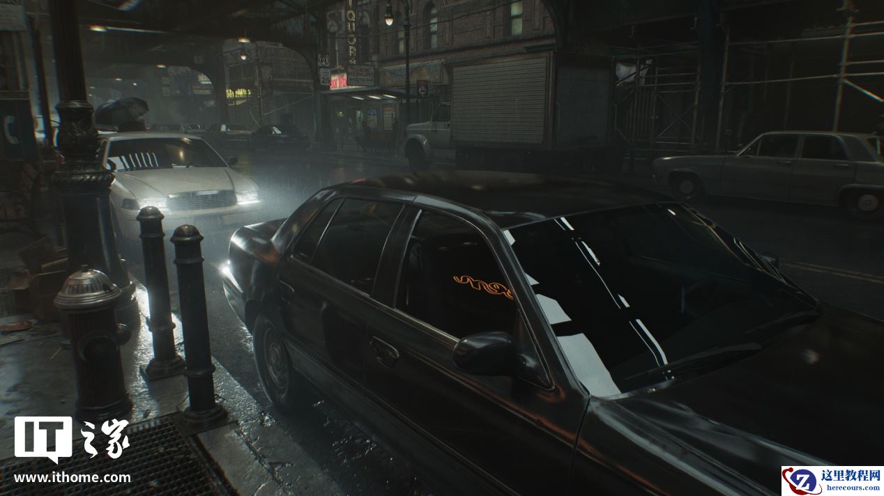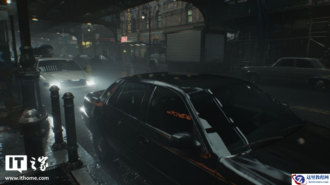 可以看到,关闭和开启光线追踪后画面的区别非常明显,在关闭光线追踪时,场景中主体黑色汽车的对比度偏低,前挡风玻璃的反射非常微弱,侧门玻璃上对于左侧街道上灯箱广告牌的反射直接变成了光带。