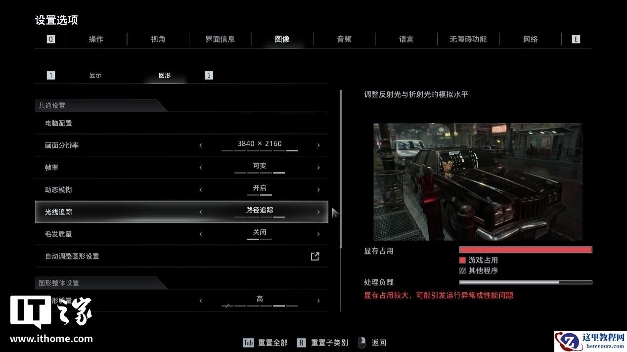 4K 分辨率 + 路径光线追踪,游戏显存占用提示
