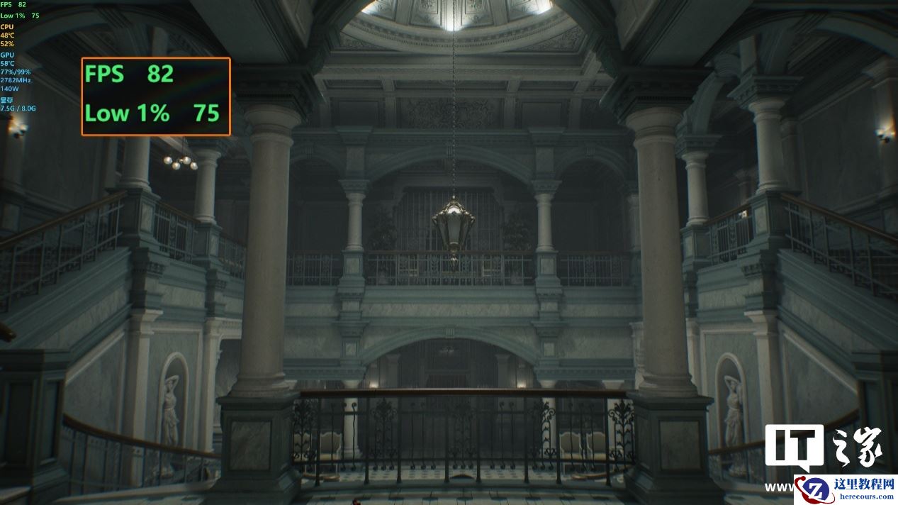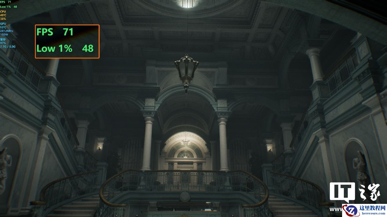 那么室内场景的表现会更好吗?第二组场景我们选择了疗养院中的大厅,主角需要多次回到这里进行一系列小解谜和搜集道具的探索,非常有代表性。同样在默认高画质预设下,1080P、2K 和 4K 分辨率的游戏平均帧数分别为 161 帧、105 帧和 53 帧,1% Low 帧分别为 139 帧、73 帧和 47 帧。