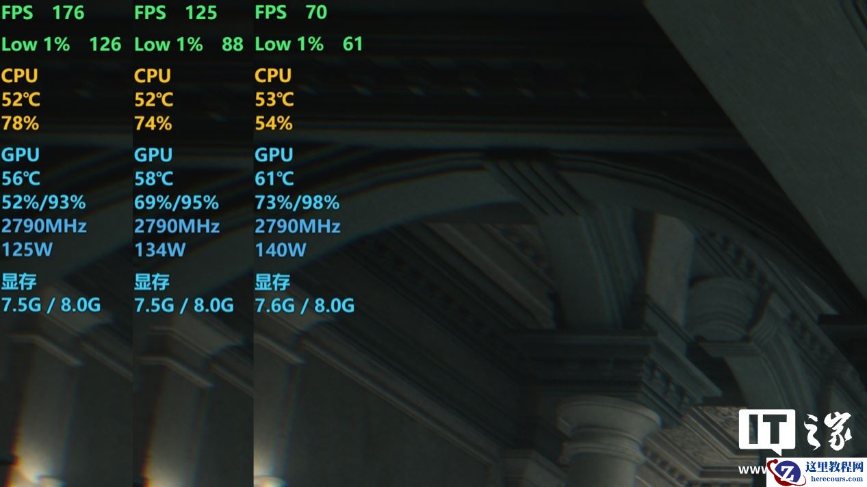 无论是 4K + 路径追踪,还是 1080P + 关闭光追,显存占用都是满载红条状态,而一旦出现“爆显存”情况,就会造成模型材质丢失,效果还不如关闭光追。对于不追求极致画面效果的玩家而言,关闭光线追踪下的画面效果就已经非常不错了。