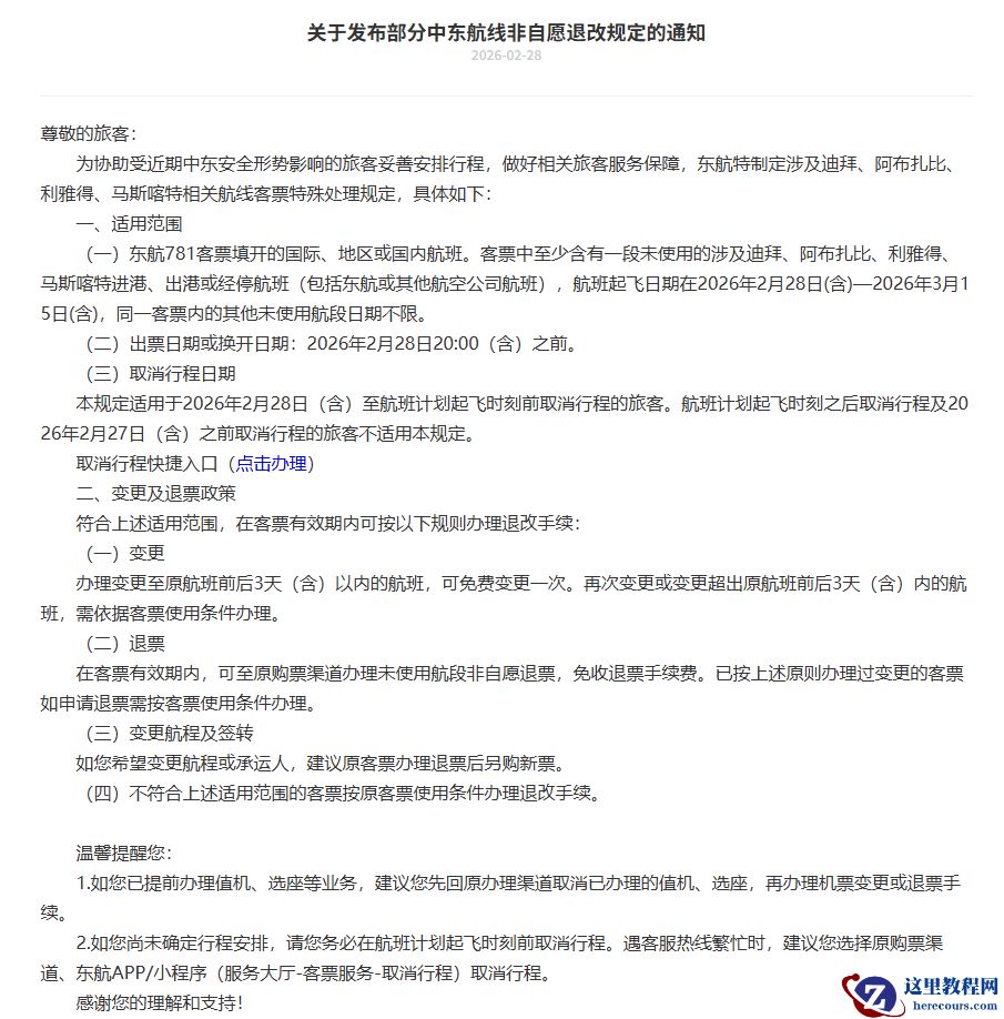 (三)在 2026 年 2 月 28 日 0 时(含)以后申请客票变更或退票(以取消客票订座时间为准)。
