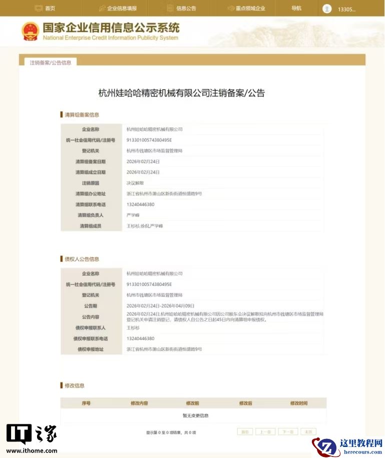 注意到,国家企业信用信息公示系统显示该公司于 2026 年 2 月 24 日发布解散公示,正在进行债权人公告。