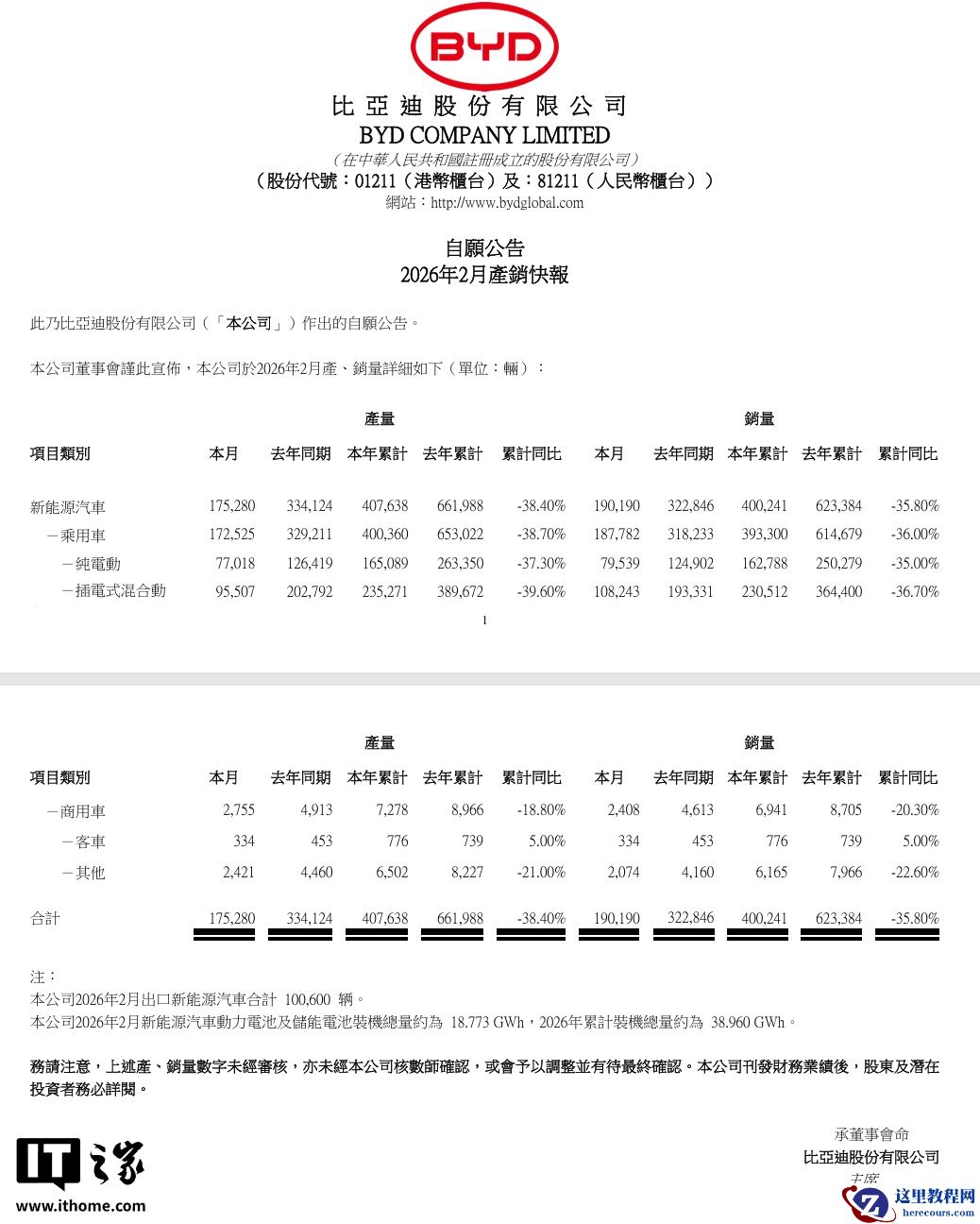 3 月 1 日消息,比亚迪 2 月新能源汽车销量 190,190 辆同比下滑 35.80%,乘用车 187,782 辆同比下滑 36.00%。