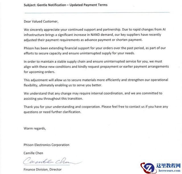 3 月 2 日消息,根据台媒《电子时报》分享的群联 Phison 函件,这家全球第三方 SSD 主控巨头与模组厂商要求下游客户针对后续订单预付款或是缩短支付周期。