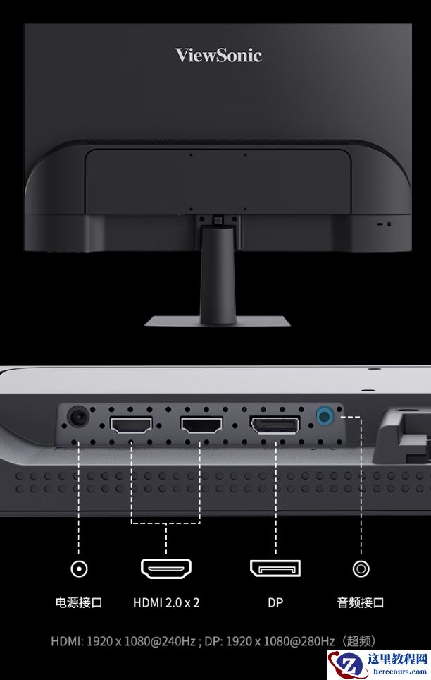 该机支架支持俯仰,显示器本体支持 VESA 75x75mm 壁挂,提供 2 个 HDMI 2.0(240Hz)、1 个 DP 1.4(280Hz)、1 个 3.5mm 音频接口。