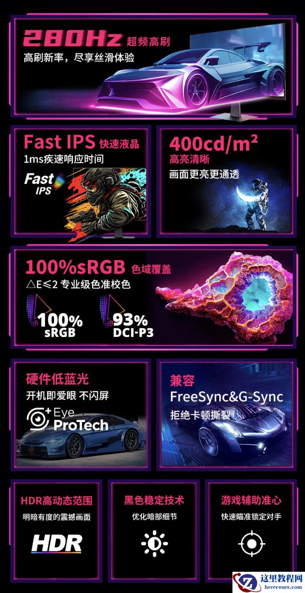 该机配备一块 1920x1080 分辨率 280Hz 超频(注:原生 240Hz)Fast IPS 面板,亮度 400 尼特,GtG 响应时间 1ms,静态对比度 1000:1,显示器支持 8-Bit 色彩,覆盖 100% sRGB 和 93% DCI-P3 色域。
