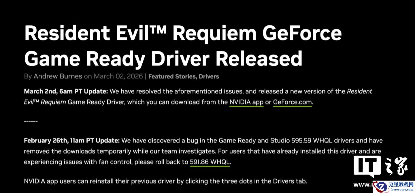 而如今,英伟达重新上线了相应驱动更新,并将其版本号提升为 595.71 WHQL,主要用于修复导致显卡风扇监控与控制软件失灵的严重问题,同时继续为《生化危机:安魂曲》和《失落星船:马拉松》带来支持。
