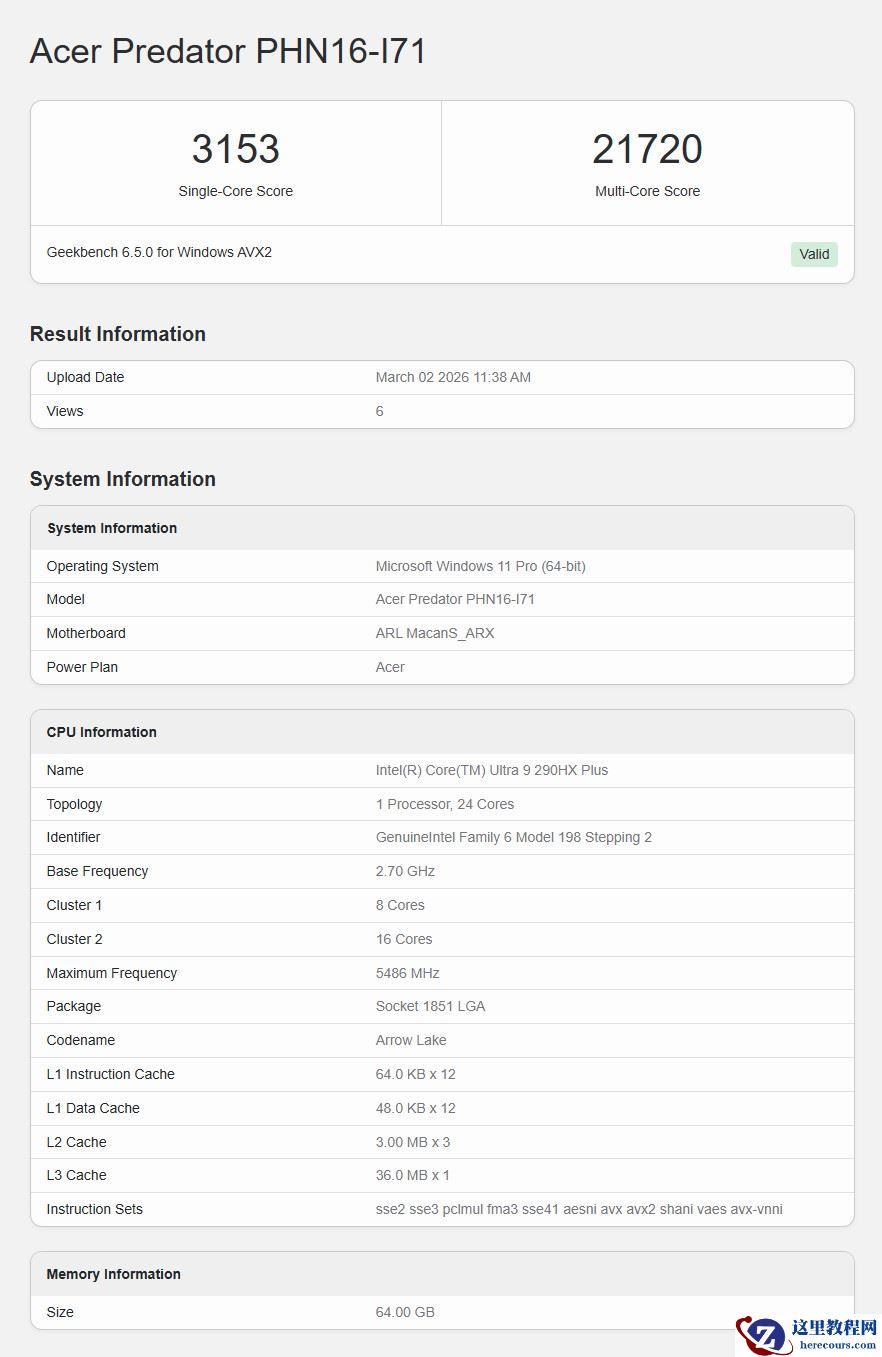 援引博文介绍,测试设备为一台配备 64GB 内存的宏碁掠夺者(Acer Predator)笔记本电脑,页面显示在 GeekBench 6.5.0 版本中,酷睿 Ultra 9 290HX Plus 的单核得分为 3153 分,多核得分为 21720 分。