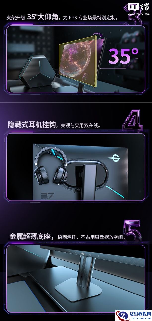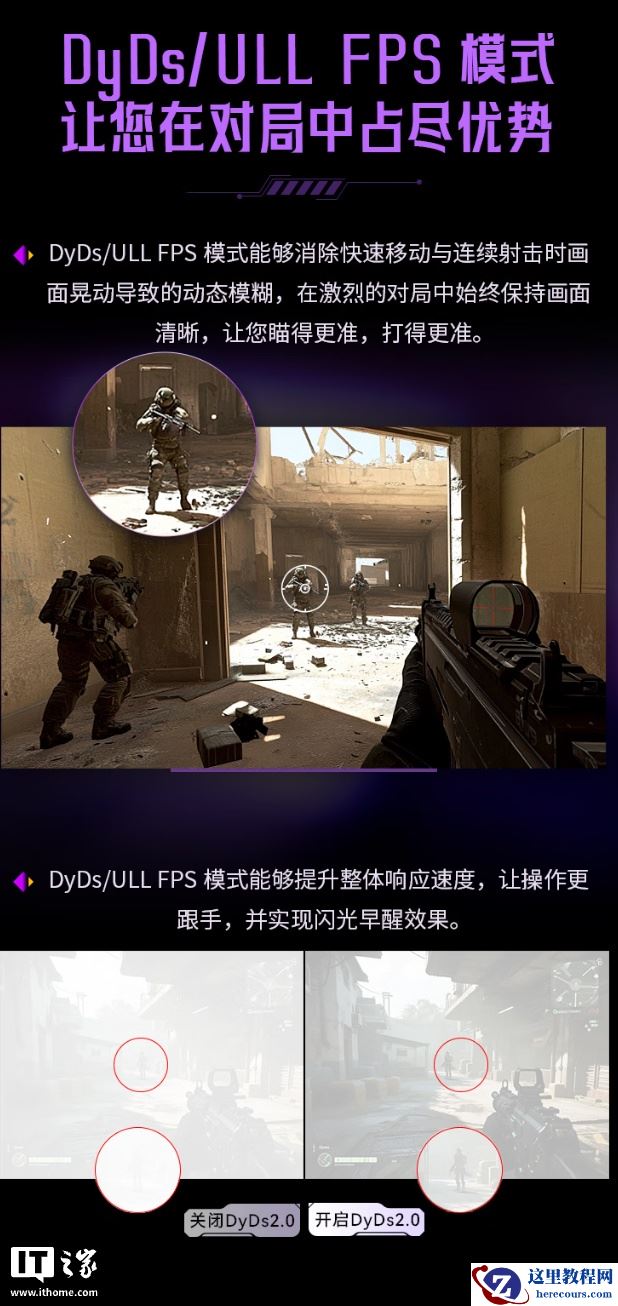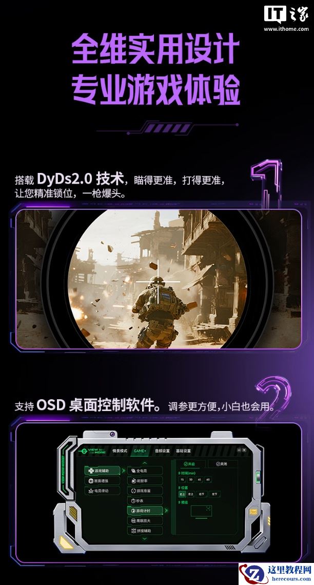 规格方面,这款显示器具备 ULL FPS 模式,能够消除快速移动、连续射击画面的动态模糊,采用硬件级低蓝光灯珠,具备 Adaptive-Sync 防撕裂模式,支持动态 OD 以及 HDR,还带有准星、秒表、计时、鹰眼放大、拼接辅助等功能。
