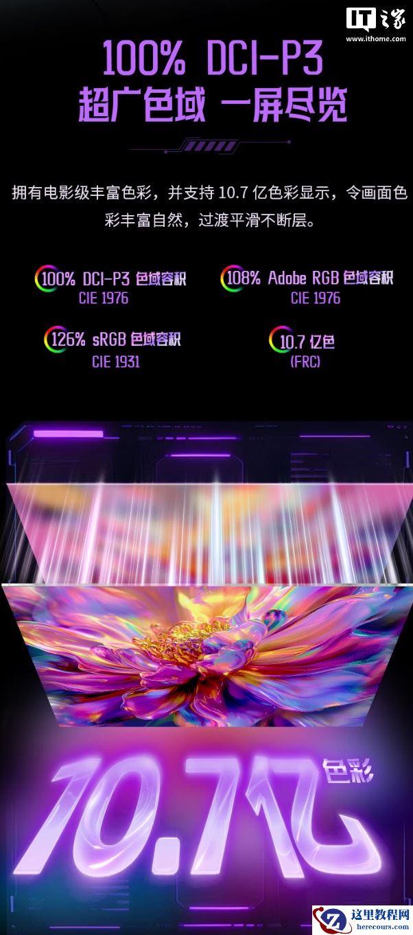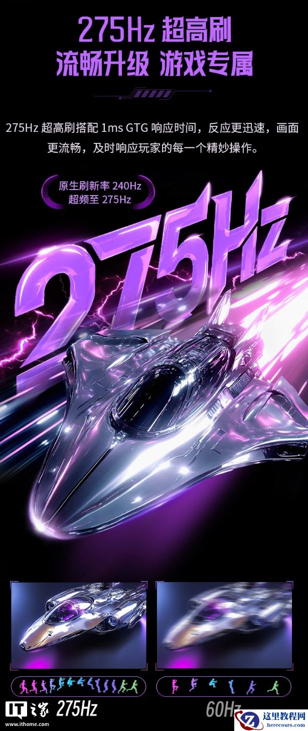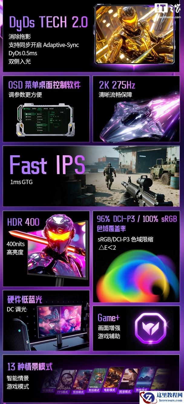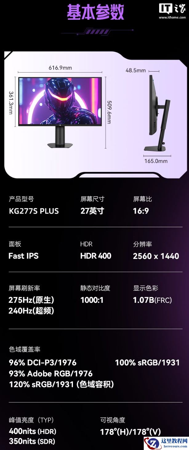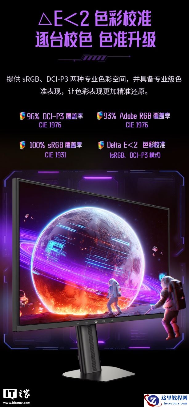 据介绍,这款显示器搭载 DyDs 2.0 技术,拥有逐行扫描双侧入光式背光,原生刷新率 240Hz,最高可超频至 275Hz,GTG 响应时间为 1ms,分辨率 2560*1440,覆盖 100% sRGB、96% DCI-P3、93% Adobe RGB 色域,DeltaE 小于 2,支持 10bit 色深(FRC)。