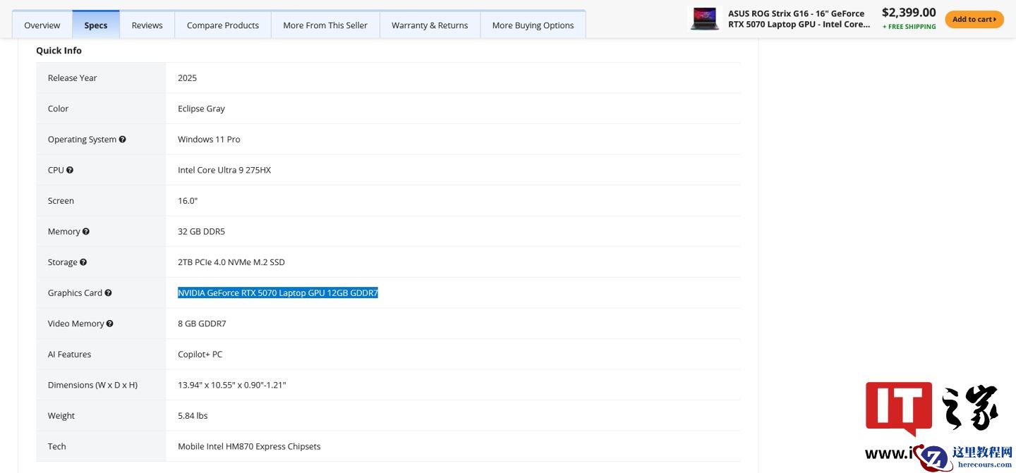 此外,根据外媒 Tom's Hardware 的发掘,华硕、惠普部分 2025 款游戏笔记本电脑在第三方电商平台上也显示了 12GB 版 RTX 5070 Laptop GPU 相关信息。