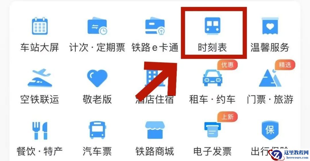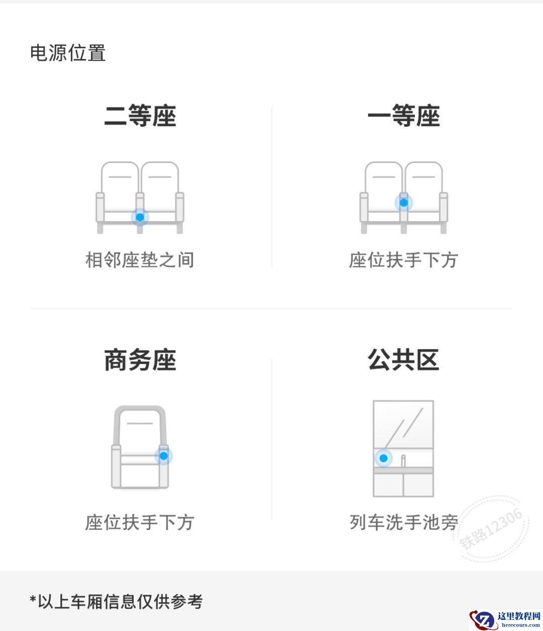 如果不清楚自己乘坐的列车是什么车型,小伙伴可以打开铁路 12306 App 首页,点击“时刻表”—— 输入“车次号”“出发日期”—— 点击“查询”—— 点击“查找电源位置”,即可查询到充电插座位置。