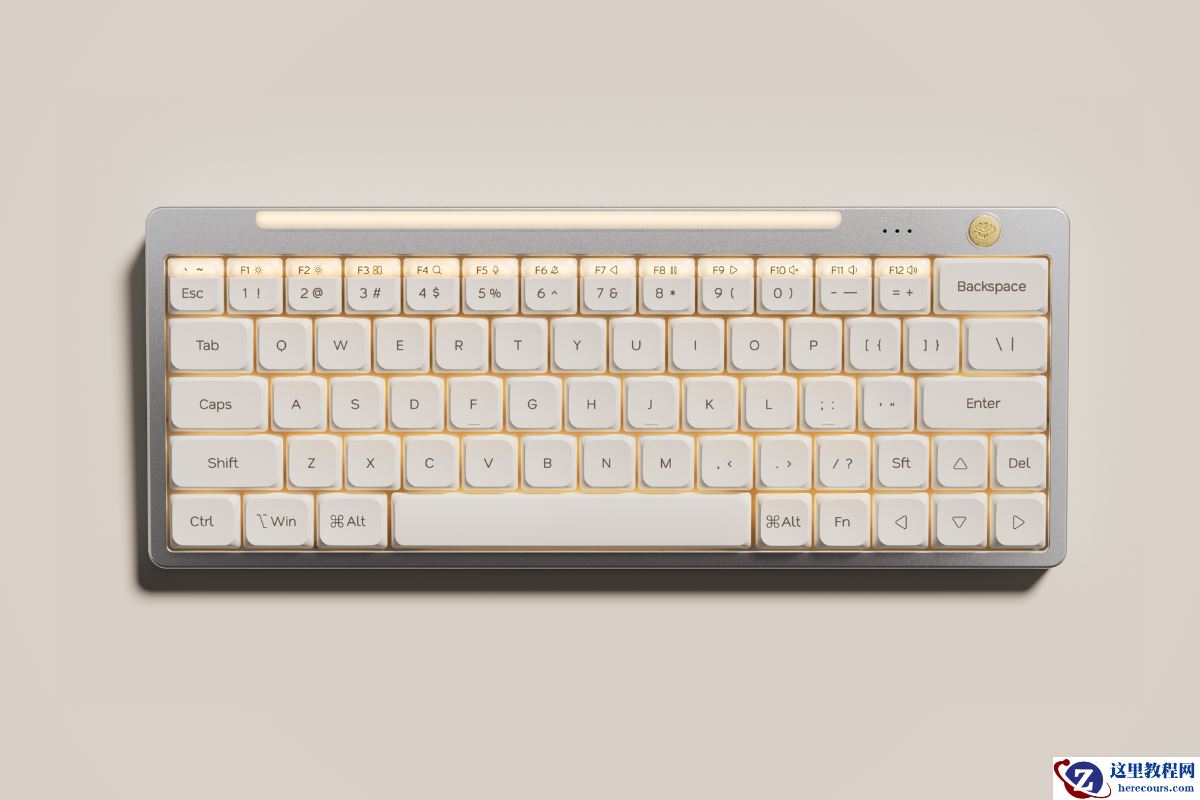 这款键盘拥有铝合金上盖和 PC 底盖并装饰以黄铜功能按钮,键帽材质为 PBT 与 PC,内置多层吸声填充,配备底部“悬浮灯环”、双区可调背光。其支持 USB-C 有线 / 2.4GHz 无线 / BT 5.3 无线三模连接,内置 150 小时续航 3000mAh 电池。