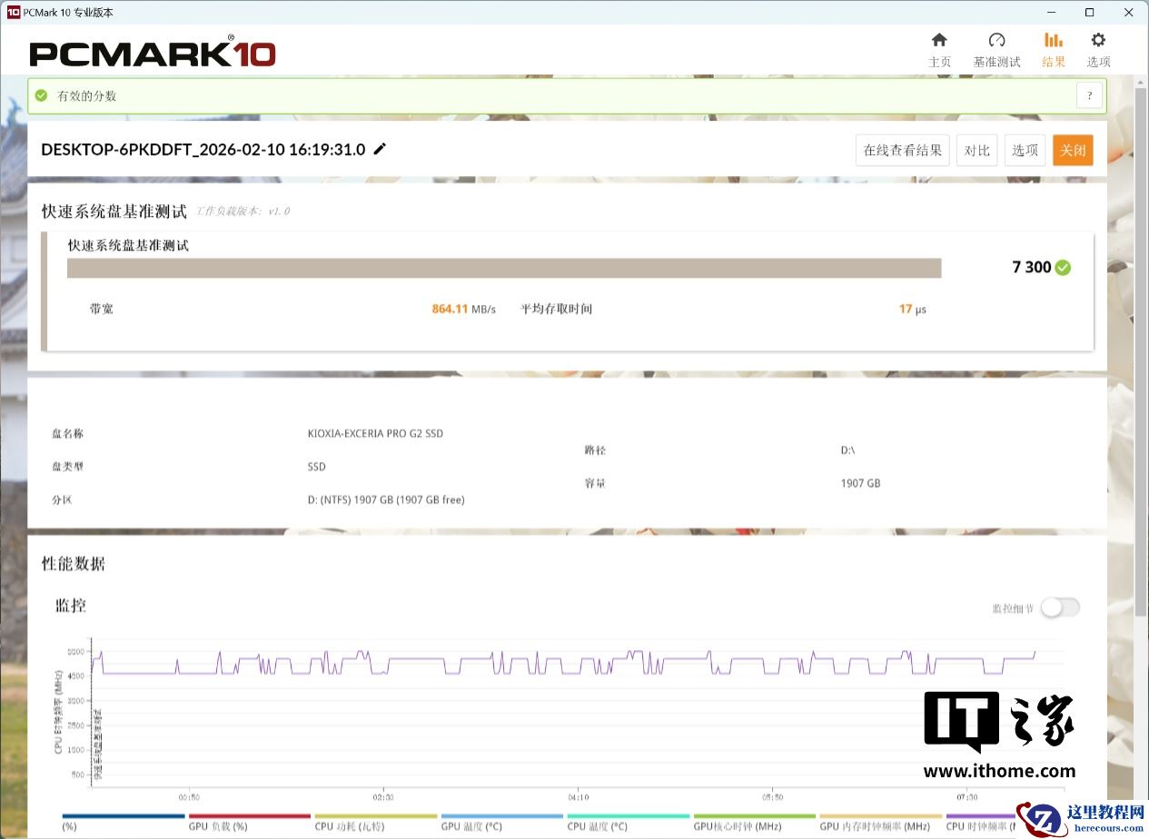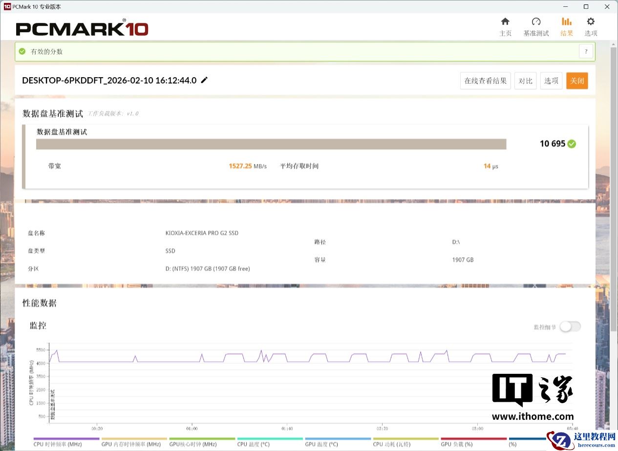 然后,我们通过 PC Mark 10 测试了其分别作为数据盘和系统盘的表现。其中系统盘的项目成绩达到了 7300 分,数据盘项目成绩为 10695 分,在一众 PCIe5.0 固态中属于名列前茅的表现。