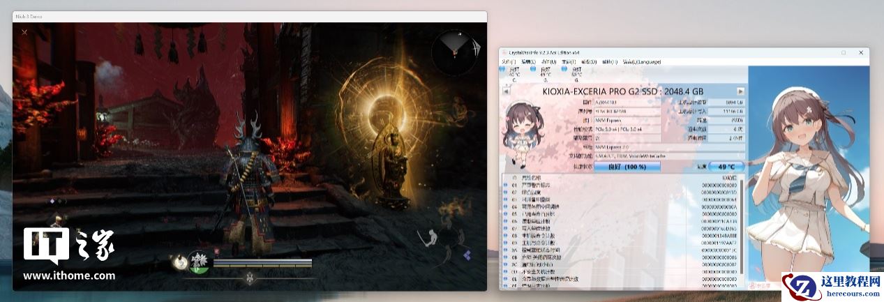 游戏运行十分钟后,CDI 显示的硬盘实时温度为 49°C,即使是在中等负载的游戏场景下,铠侠 Exceria PRO G2 固态硬盘依旧没有超过 50°C,玩家朋友们可以放心入手。