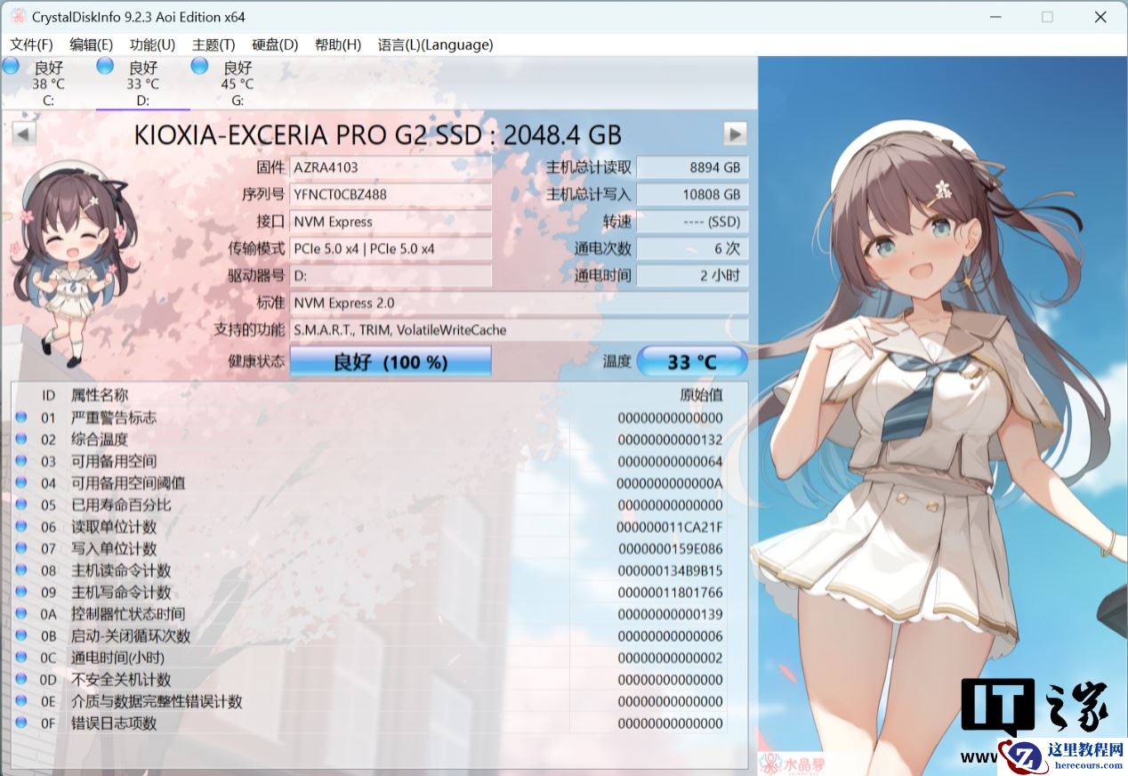 最后,通过 CDI 查看硬盘的 S.M.A.R.T 信息基本信息,其支持 NVMe 2.0 协议标准,容量为足容的 2048.4GB,这点值得好评。