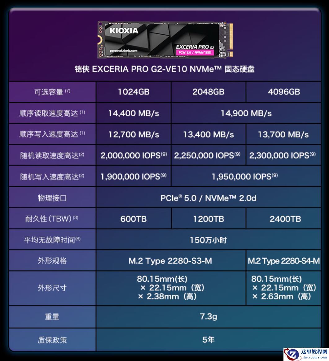 铠侠 EXCERIA PRO G2 固态硬盘首发包含 1TB、2TB 和 4TB 三种容量,作为定位旗舰的 Gen5 固态,官方给到的规格参数如下图所示。
