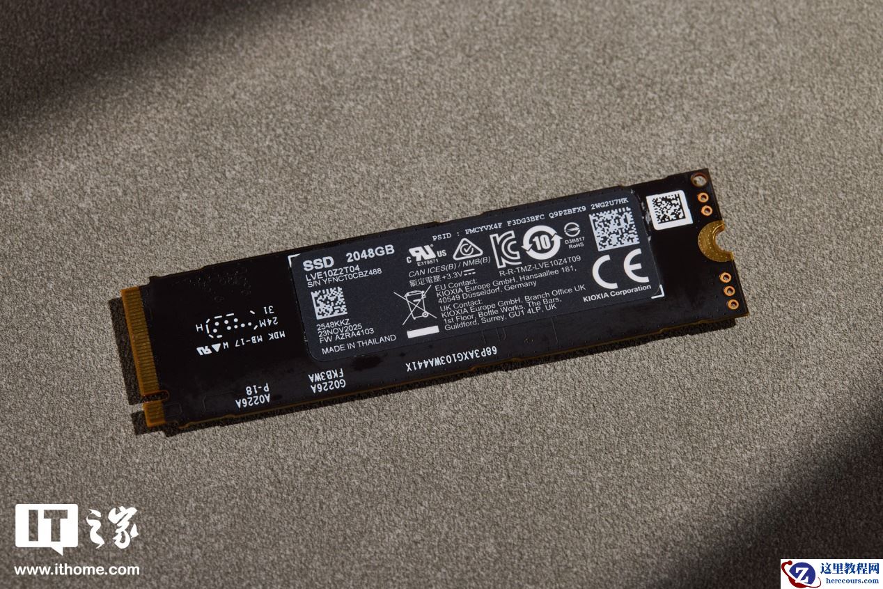 再右侧还有 2 颗铠侠原厂的 TLC NAND 闪存颗粒,全称为 BiCS8 FLASH TLC NAND 闪存颗粒,单颗容量 1024GB。