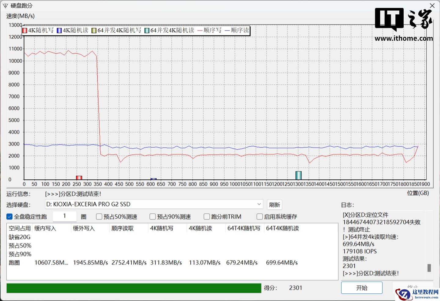 在经过一轮全盘稳定性跑圈测试后,铠侠 Exceria PRO G2 固态硬盘 2TB 版本的顺序读取速度为 2752MB/s,缓内写入速度为 10607MB/s,缓外写入速度 1945MB/s。4K 随机平均读写速度分别为 113MB/s 和 311MB/s。