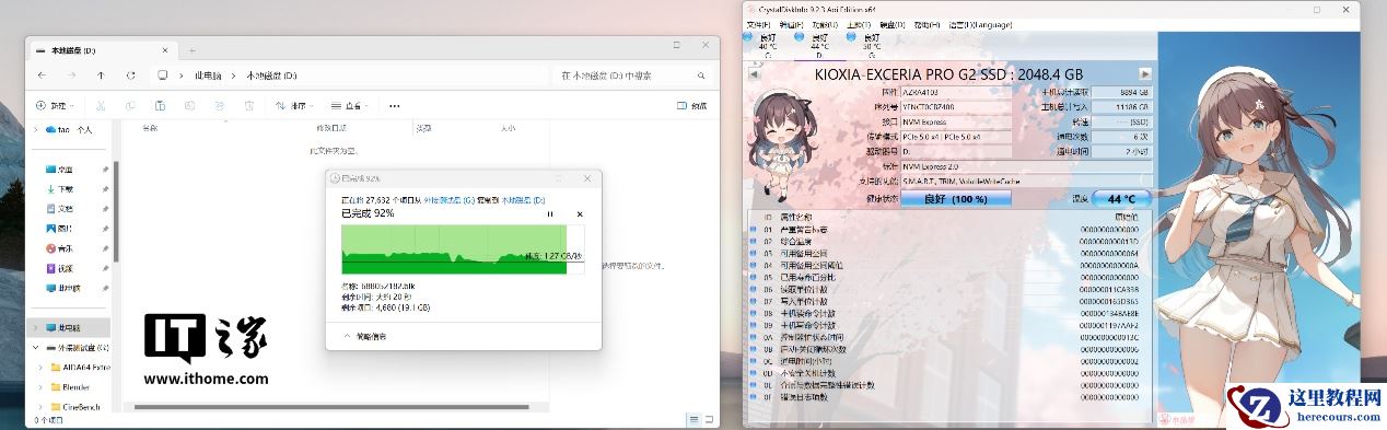 在使用外接固态硬盘向铠侠 Exceria PRO G2 固态硬盘中持续写入 256GB 的大数据量游戏客户端文件夹情况下,硬盘温度上升到了 44°C,也是完全可以接受的表现。