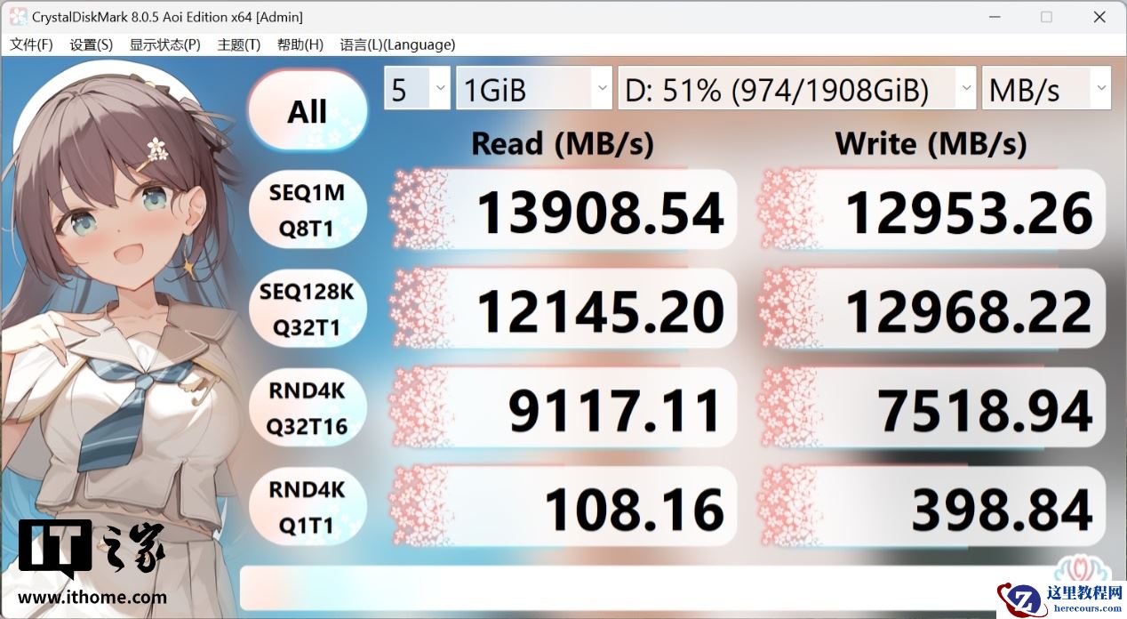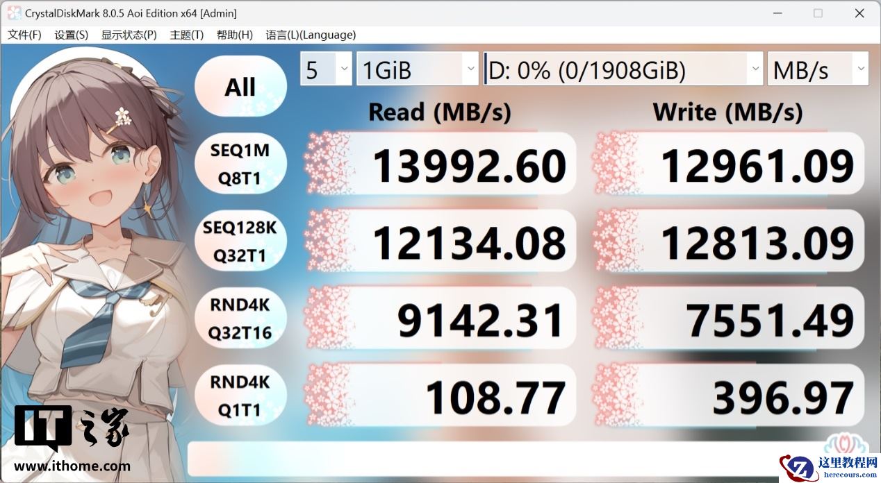 首先,通过硬盘跑分软件 Crystal Disk Mark 对其进行理论读写跑分,由于平台限制,在空盘状态下铠侠 Exceria PRO G2 固态硬盘的顺序读取速度跑到了 13992MB/s,写入速度跑到了 12961MB/s。如果放在 AMD 平台基本可以跑满标称顺序读写速度。其 4K 读写速度分别达到了 9142MB/s 和 7551MB/s。